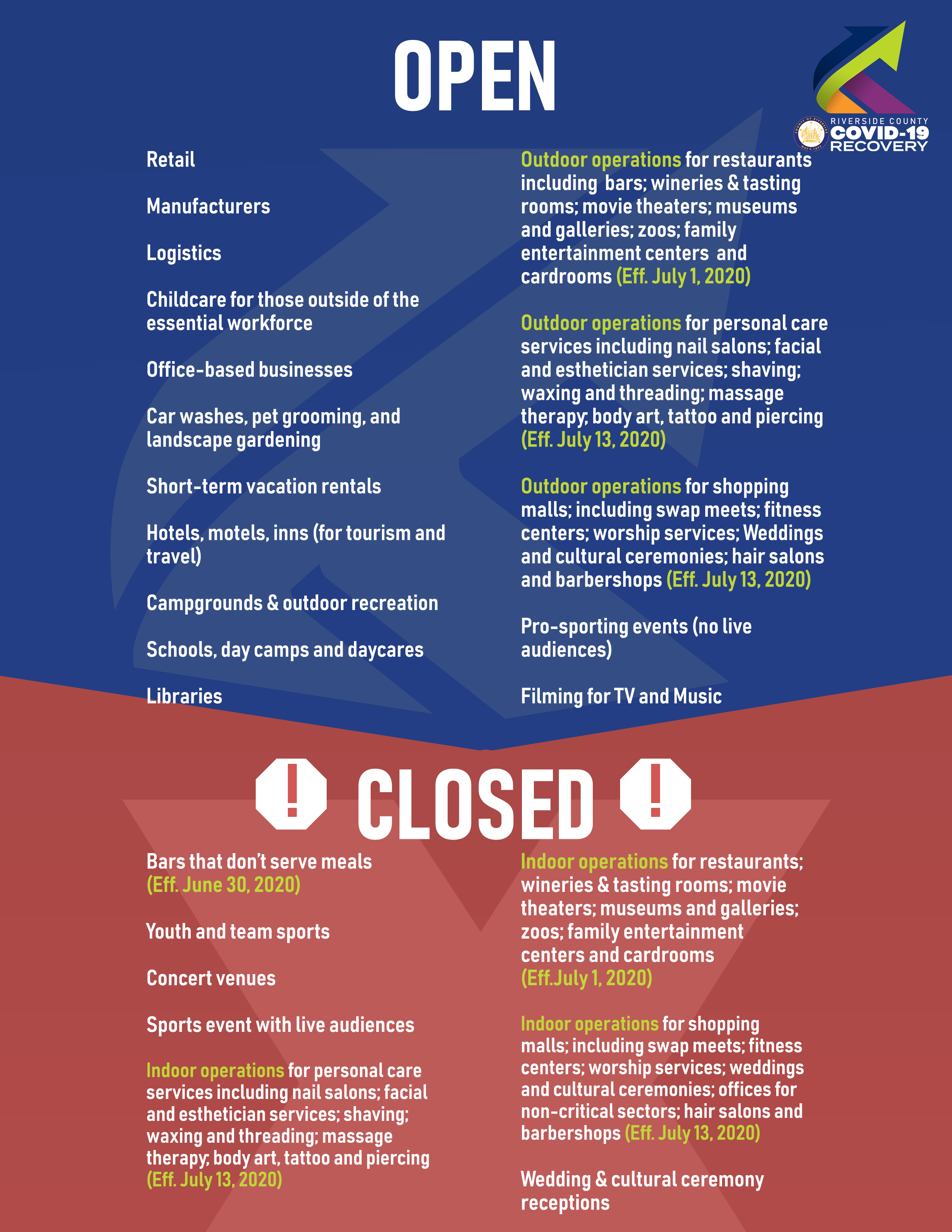 Click here to view the Riverside University Health System Public Health Advisory Concerning Live Music Events released July 20th. Click here for a list of testing facilities in Riverside County. Click here for a list of cooling centers in Riverside County.
